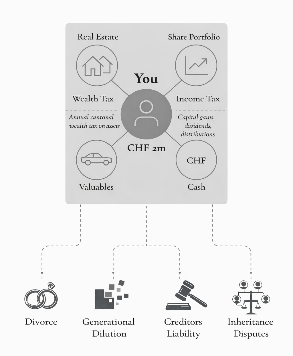 You've built significant wealth—CHF 2M+ across real estate, portfolios, and other holdings.