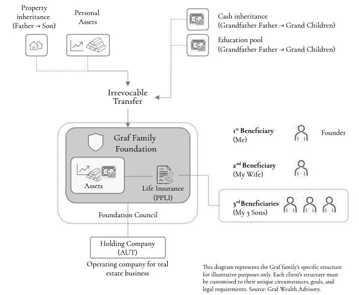 A Liechtenstein Family Foundation is a legally independent entity with no shareholders—it owns itself. You establish it through a Foundation Deed that defines the purpose, names beneficiaries, and sets binding rules for governance and distributions. The Foundation Council (at least 2 members, including a qualified Liechtenstein trustee) manages the assets according to your instructions. You can be a council member yourself and can reserve the right to appoint and remove other members. This is not a discretionary trust—you set the rules, and the council must follow them. The foundation is registered in Liechtenstein but can hold assets worldwide, including Swiss real estate, international portfolios, and business holdings.